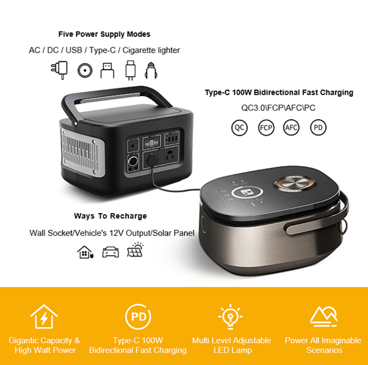 သင် အပြင်ထွက်သည့်အခါ၊ ဤ 600W မြင့်မားသော ခိုင်ခံ့သော Portable Power station ဖြင့်။ သင့်မိုဘိုင်းဖုန်းကို တိုက်ရိုက်အားသွင်းရုံသာမက ရေဆူရန် ပြင်ပ multi port plug ကိုလည်း အသုံးပြုနိုင်သည်။ ၎င်းသည် အဆင်ပြေပြီး လက်တွေ့ကျသော ပြင်ပလိုအပ်ချက်တစ်ခုဖြစ်သည်။